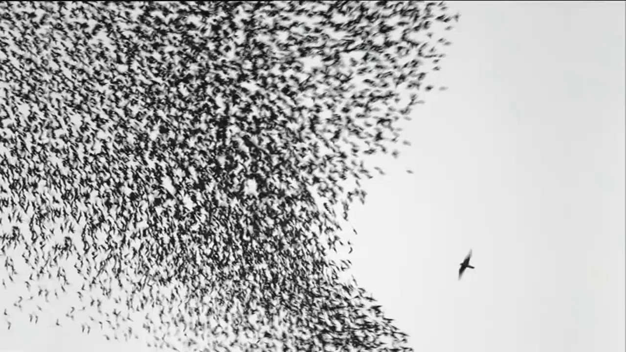 Alright, I'm cheating again with the art this week, but in my defense, Sky Blue Sky's album cover predates the album itself. This photo is actually Manuel Presti's prize-winning photo "Sky Chase," which won him Wildlife Photographer of the year in 2005 and was later featured in National Geographic in 2007. It depicts a swarm of starlings flanked by a lone peregrine falcon, waiting for its moment to swoop in and strike. Even despite these ominous implications, there's something that feels so serene about this photo—the depth suggested with scarcely more than light and shadow is incredible, and the flurry of blurred wings almost looks pencilled. Even the falcon bit feels like more than a lurking predator—rendered in black and white, this bird, indistinguishable from the rest, just looks like an outsider flying separate from the flock.